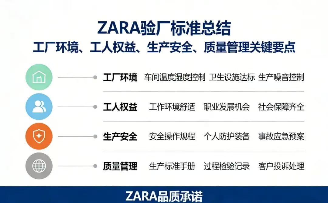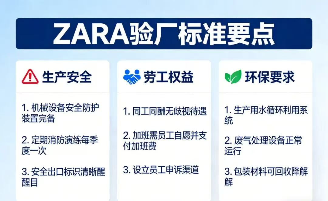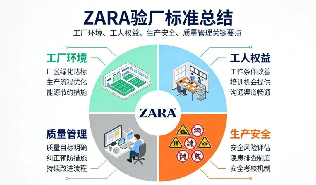 ZARA验厂标准贯穿生产全流程,核心可归纳为劳工权益和环境保护两大维度,其中劳工权益审核采取“零容忍”原则,直接决定审核成败;环境保护则区分普通工厂与湿加工工厂实施双重标准。