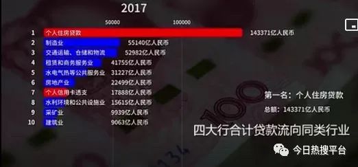 四大行合计,2017年“个人住房贷款”达到143371亿人民币,是排在第二的“制造业”55140亿人民币的2.6倍。