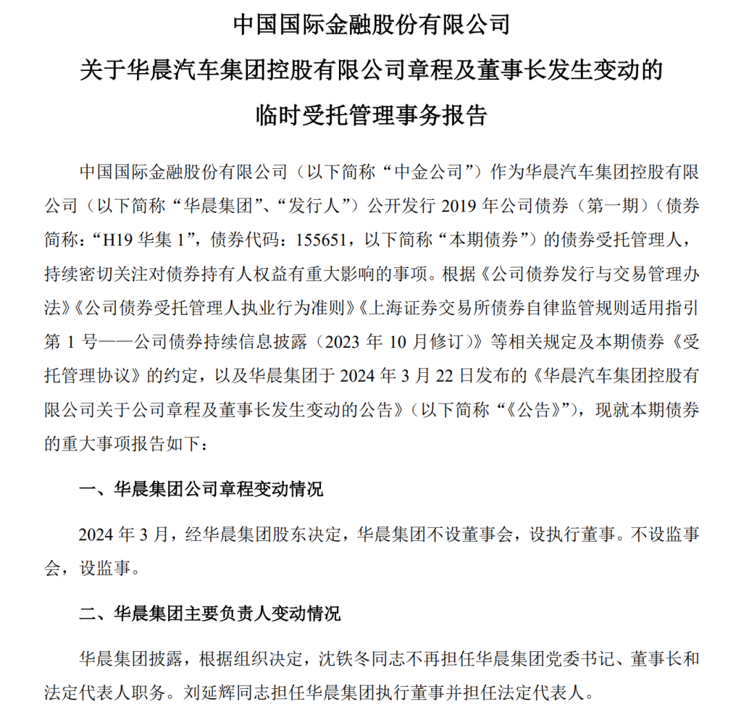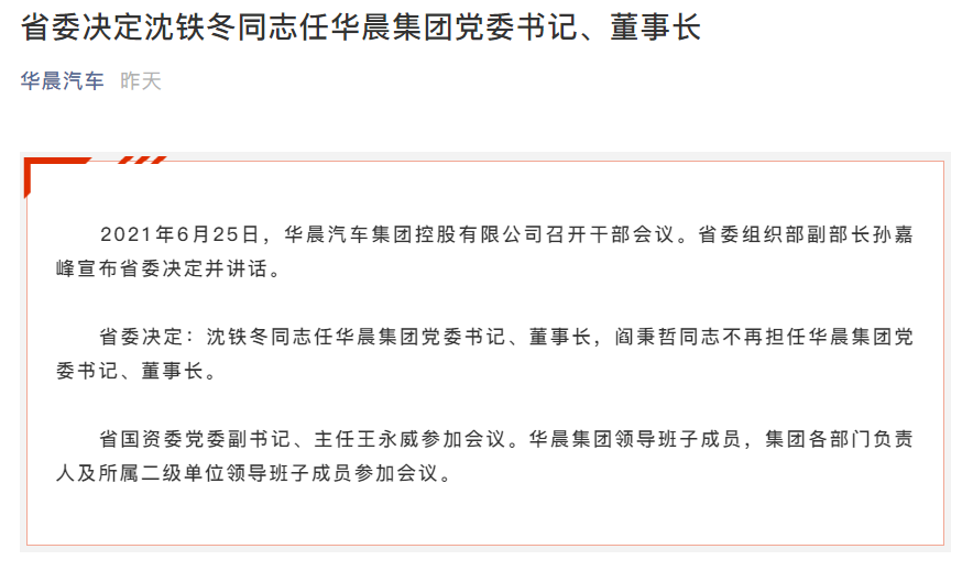 在此次重大人事变动之前,3月21日,华晨集团发生人事变动,刘鹏程卸任总经理,由张悦接任,刘延辉为法定代表人、执行董事,沈铁冬退出。同时,公司多名董事、监事也卸任,新增监事孙英。此次变更发生在华晨集团控股股东变更后,原股东辽宁省社会保障基金理事会(省产业(创业)投资引导基金管理中心)、辽宁省人民政府国有资产监督管理委员会退出,其100%股权转让至沈阳汽车,正式成为沈阳汽车有限公司的全资子公司。