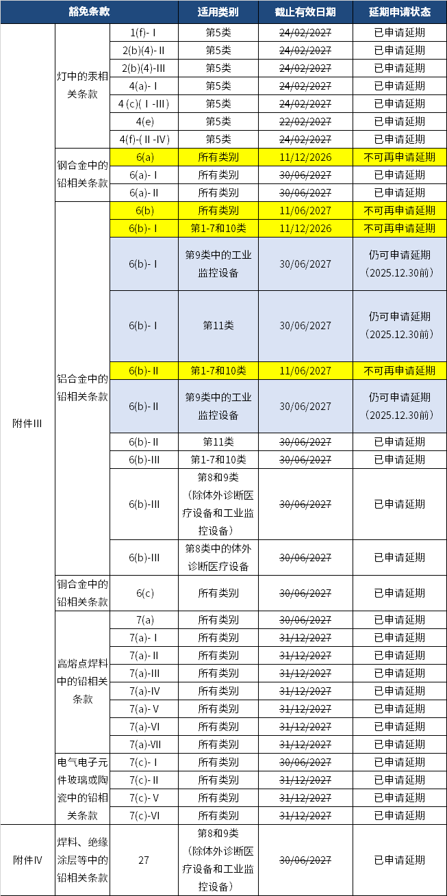 下表汇总了截至目前,在本年度提交了延期申请的豁免条款。企业需特别注意:合金中的铅豁免条款,大部分已提交延期申请,少部分已关闭延期申请通道,而极少类别正处于“最后窗口期”,需要提交申请的企业需抓紧时间!