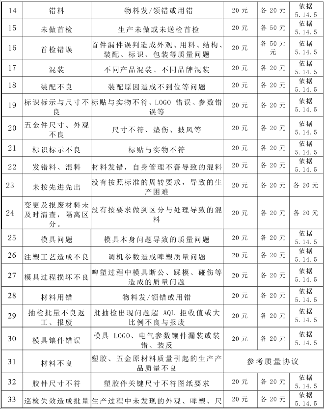 检验员错检(首件判定错误)、漏检(未按规定时间或未按照抽样标准抽检)造成批量产品不合格导致的损失金额。
