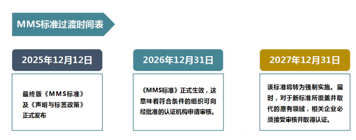 MMS标准将于2026年12月31日生效,并自2027年12月31日起强制实施。届时将全面取代 GRS、RCS、RWS等主流可持续认证,终结纺织供应链认证碎片化问题。