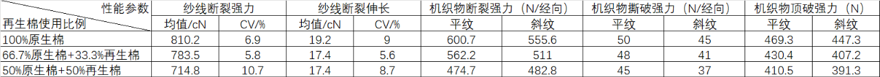 为66.7%/33.3%及50%/50%时,首次机械回收的废棉机织物的断裂强力、顶破强力及撕破强力,相较于原棉机织物依次最高