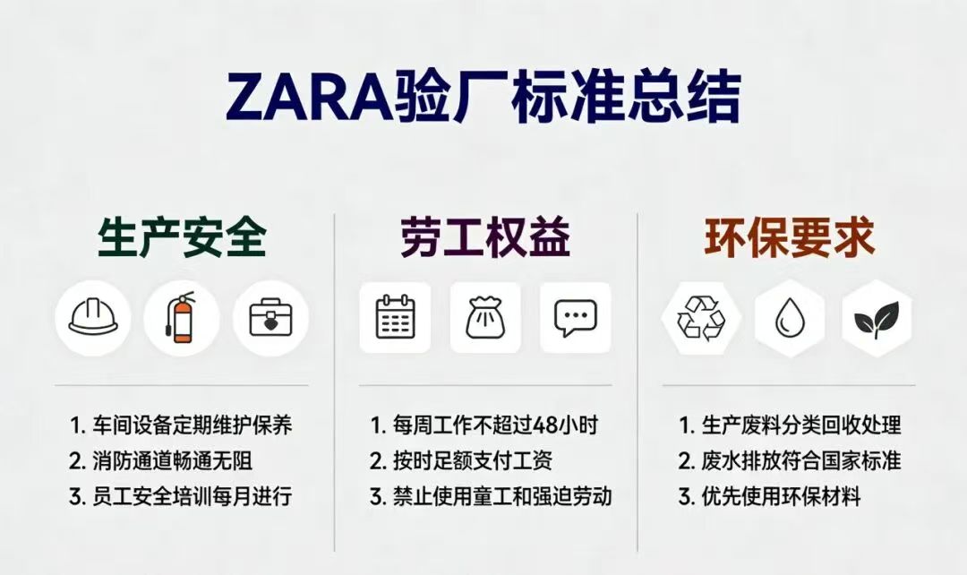 ZARA验厂标准贯穿生产全流程,核心可归纳为劳工权益和环境保护两大维度,其中劳工权益审核采取“零容忍”原则,直接决定审核成败;环境保护则区分普通工厂与湿加工工厂实施双重标准。