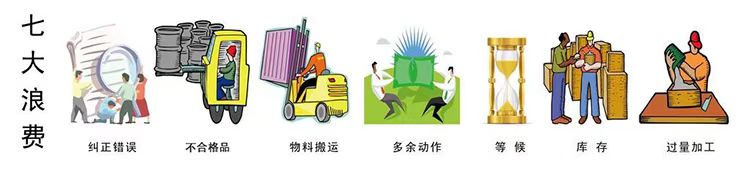 等待、搬运、不良返工、多余动作、过度加工、库存积压、过量生产(最大浪费)。